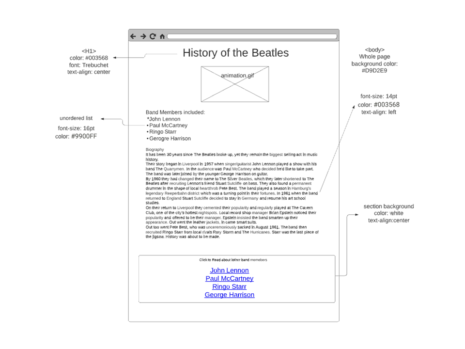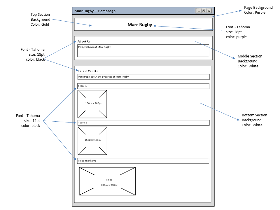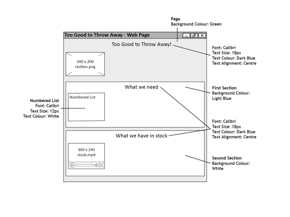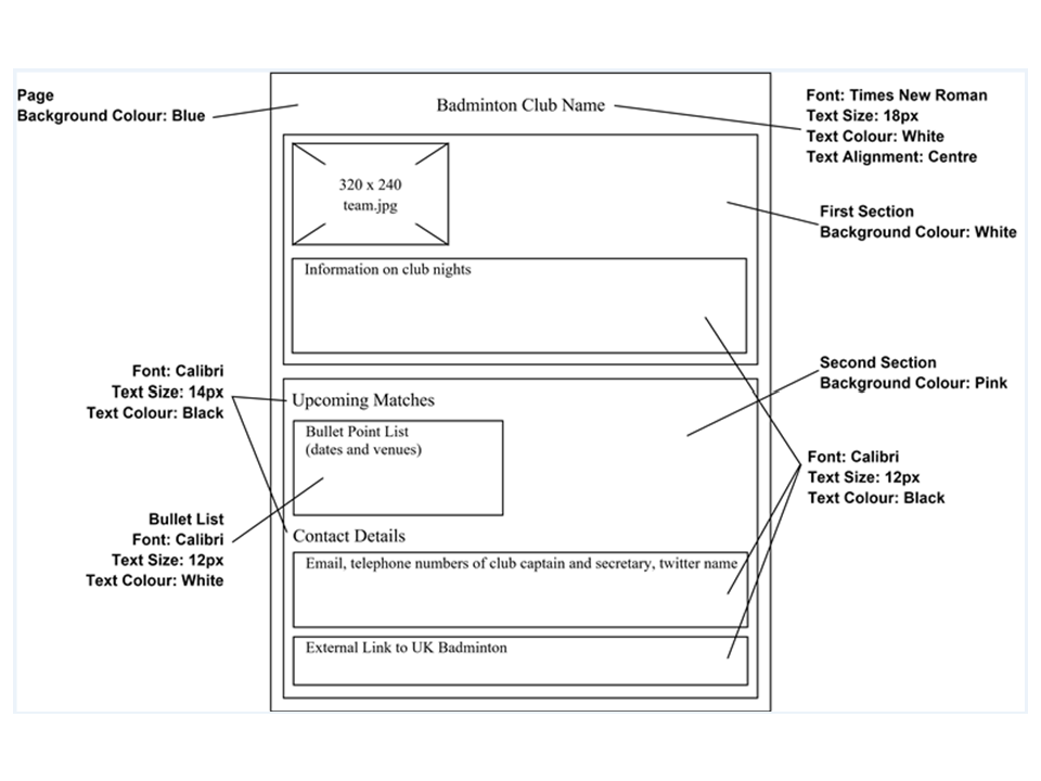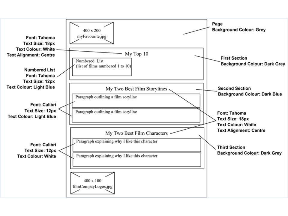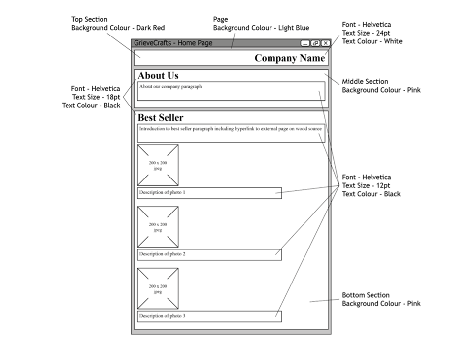 The user-interface planning can be illustrated using wireframes. A separate wireframe is needed for each page on a website. Each wireframe indicates the intended layout of the page and shows the position of: