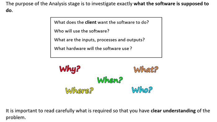 Analysis is the first phase of software development. A client will ask a software development team to develop a piece of software. To begin with, a systems analyst will meet with the client to determine: