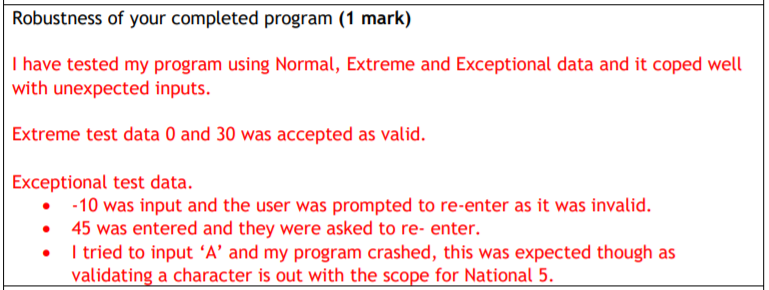 For example, a program has been developed to ask the user to input their age as an integer. However, a user accidentally types their age in as a string. If the program was to crash then it would not be a robust program.